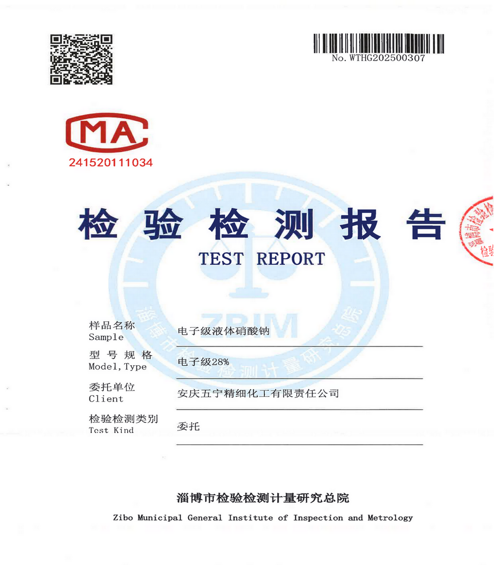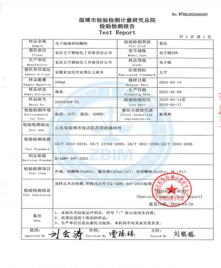 行业标准:符合Q/AQWN 047-2025(电子级液体硝酸钠企业标准)。